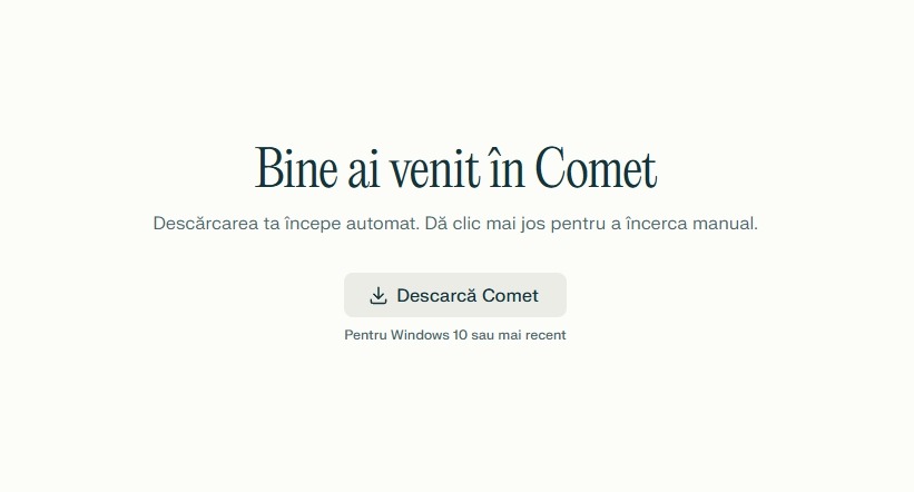 - Accesează site-ul oficial al Perplexity (perplexity.ai/comet) și descarcă versiunea compatibilă cu sistemul tău de operare — Windows sau macOS.